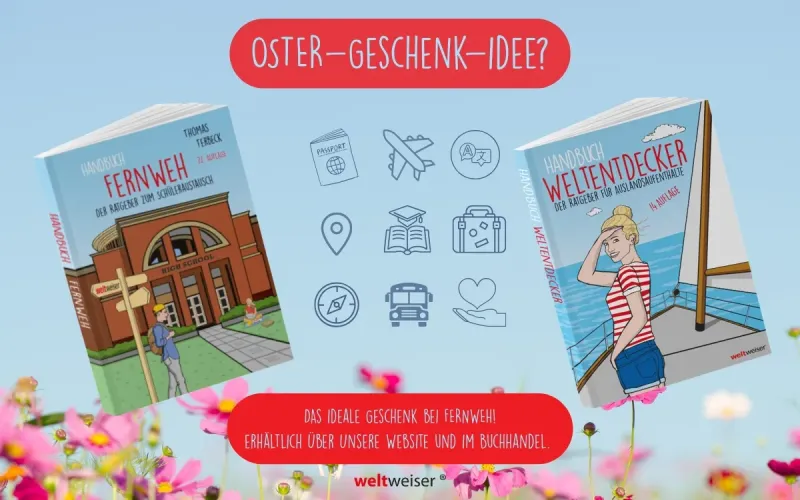 Wer jungen Menschen zu Ostern mehr schenken möchte als Süßigkeiten, liegt mit einem Buch voller Fernweh-Ideen und Insider-Tipps genau richtig: Die aktuellen Auflagen der Ratgeber Handbuch Fernweh (https://weltweiser.de/publikationen/handbuch-fernweh/) und Handbuch Weltentdecker (https://weltweiser.de/publikationen/handbuch-weltentdecker/) sind praktische Guides für alle, die einen Auslandsaufenthalt planen - von der ersten Idee bis zur Ausreise!