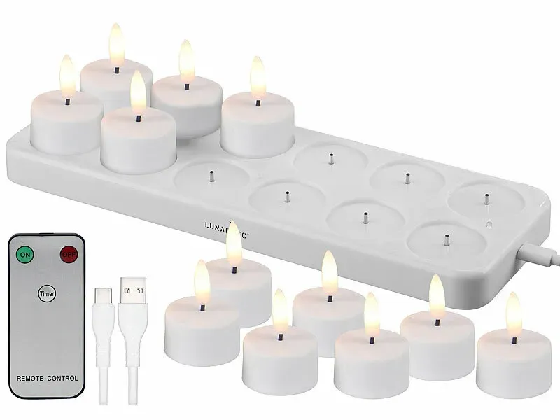 - 12er-Set wiederaufladbare LED-Teelichter mit realistischer Docht-Flammenoptik