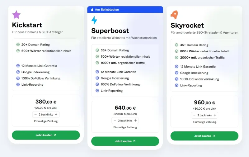 -Superboost: Die beliebteste Variante enthält Links mit einem Domain-Rating von wenigstens 35 und einem monatlichen Traffic von 1.000. Inklusive redaktionellem Content von mindestens 700 Wörtern - 640 Euro.