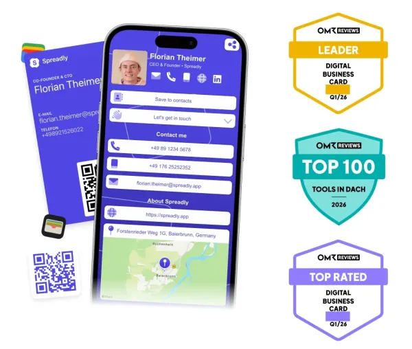 Die Spreadly GmbH erzielt zum vierten Mal in Folge die Auszeichnung als bester Anbieter für digitale Visitenkarten durch OMR Reviews. Diese Kontinuität unterstreicht die hohe Kundenzufriedenheit und die technische Überlegenheit der Plattform. Zusätzlich sichert sich das Unternehmen einen Platz unter den Top 100 Software-Lösungen im gesamten DACH-Raum. Kunden schätzen vor allem das unkomplizierte Handling sowie die direkte Betreuung bei der Implementierung in bestehende Unternehmensstrukturen. Die Vielfältigkeit und tiefe Konfigurierbarkeit der Lösung erlauben eine exakte Anpassung an das jeweilige Corporate Design.
