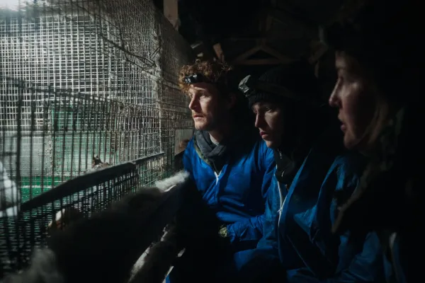 Bereits in der ersten Nacht betrat das Team nach Mitternacht bei eisiger Kälte heimlich eine Pelzfarm. Anhand der an den Käfigen angebrachten Zuchtkarten erkannten die Tierschützer*innen, dass es sich um eine Saga Furs zertifizierte Farm handelt. Saga Furs ist ein international tätiges Pelz-Auktionshaus, das mit eigenen Tierwohl-Zertifizierungen wirbt. Zu sehen sind Füchse, darunter extrem überzüchtete sogenannte "Monsterfüchse", sowie Marderhunde in engen Drahtkäfigen. Viele Tiere zeigen Verletzungen, apathisches Verhalten und stereotype Bewegungen.