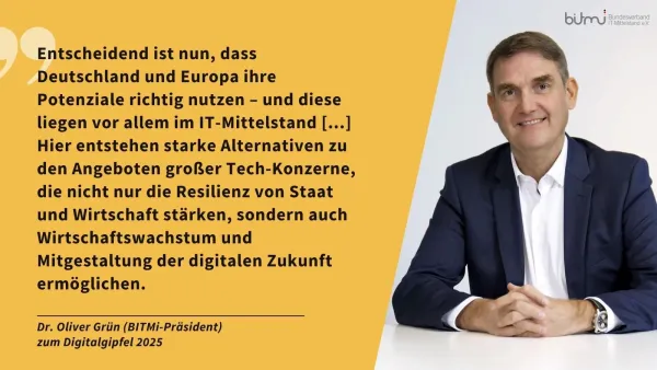 "Entscheidend ist nun, dass Deutschland und Europa ihre Potenziale richtig nutzen - und diese liegen vor allem im IT-Mittelstand, der die meisten Arbeitsplätze der Digitalwirtschaft in Europa stellt", erklärt Dr. Oliver Grün, Präsident des BITMi, im Vorfeld des Gipfels. "Hier entstehen starke Alternativen zu den Angeboten großer Tech-Konzerne, die nicht nur die Resilienz von Staat und Wirtschaft stärken, sondern auch Wirtschaftswachstum und Mitgestaltung der digitalen Zukunft ermöglichen. Unter diesem Blickwinkel begrüßen wir es, soweit die Politik uns gemeinsam mit unserem europäischen Dachverband, der European DIGITAL SME Alliance, einbezieht."