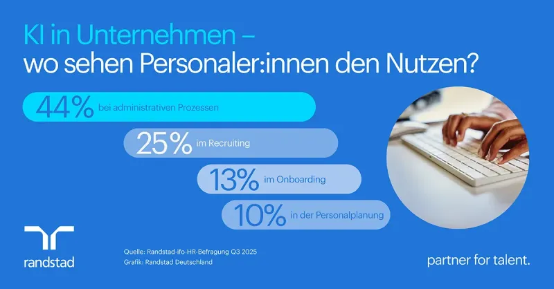 Eschborn, Oktober 2025 - Welche Rolle spielt Künstliche Intelligenz (KI) im Personalwesen? Die Randstad-ifo-HR-Befragung für das dritte Quartal 2025 zeigt: Knapp 64 % der Unternehmen in Deutschland bewerten den bisherigen Nutzen von KI in diesem Bereich noch als "gering" oder "eher gering". Aber: Für die nächsten drei Jahre erwarten HR-Verantwortliche eine deutliche Zunahme des KI-Nutzens in Personalabteilungen.