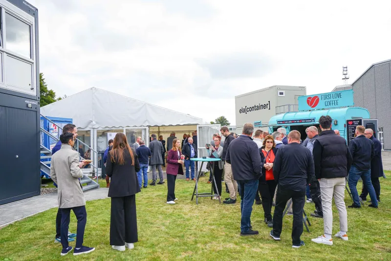Nach den offiziellen Grußworten und Danksagungen durch die ELA Container Geschäftsführung führte ein Rundgang über das Gelände die Gäste durch die modernen Büro- und Hallenflächen. Anschließend blieb bei Snacks, feinen Häppchen eines regionalen Caterers und Kaffeespezialitäten vom Barista ausreichend Zeit für persönliche Gespräche, Austausch und Networking in entspannter Atmosphäre.