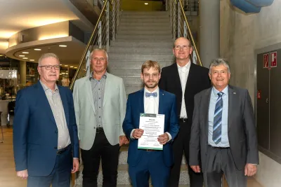 Prof. Dr. Sehr, der die Masterarbeit in Zusammenarbeit mit Prof. Dr. Takahiro Yoshida von der Tokyo University of Science in Japan, betreute, beglückwünschte M. Eng. Johannes Kiener zusammen mit den regionalen Vertretern des Berufsverbandes Dipl.-Ing. Helmut Steinberger (Bezirksvorsitzender) und Dipl.-Ing. Peter Stöberl (Mitglied des Bundesvorstandes), zu seiner herausragenden, mit dem Förderpreis ausgezeichneten Abschlussarbeit. Diese Masterarbeit zeigt auch die sehr gute wissenschaftliche Zusammenarbeit, die die OTH Regensburg international pflegt.