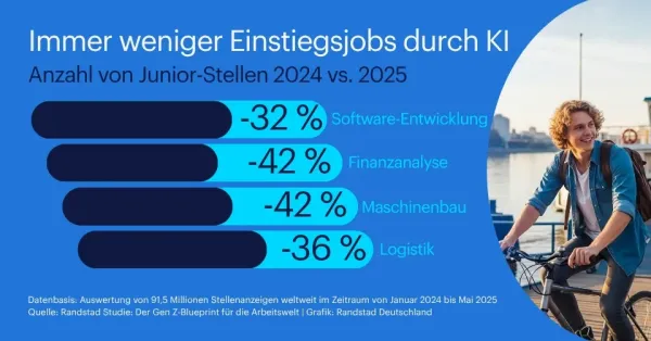 "Das Potenzial für Automatisierung durch KI ist in vielen Branchen enorm - und Unternehmen weltweit machen offenbar reichlich Gebrauch davon, insbesondere bei Stellen, die klassisch von Absolvent:innen oder Auszubildenden besetzt werden. Und diese globale Entwicklung macht sich auch in Deutschland allmählich spürbar, wie wir in Befragungen unter Arbeitnehmenden sehen", sagt Susanne Wißfeld, Geschäftsführerin Business Innovations & Concepts bei Randstad Deutschland.