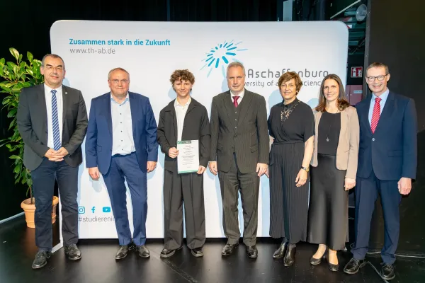 Foto v.l.n.r.: Prof. Dr. Jürgen Vaupel, Alexander Wiegand (WIKA), Mika Wissel (Preisträger), Dr. Heinz Leymann (IfKom), Prof. Dr. Eva-Maria Beck-Meuth, Yvonne Busch (Ausbildungsleiterin WIKA Alexander Wiegand SE & Co. KG), Prof. Dr. Hinrich Mewes