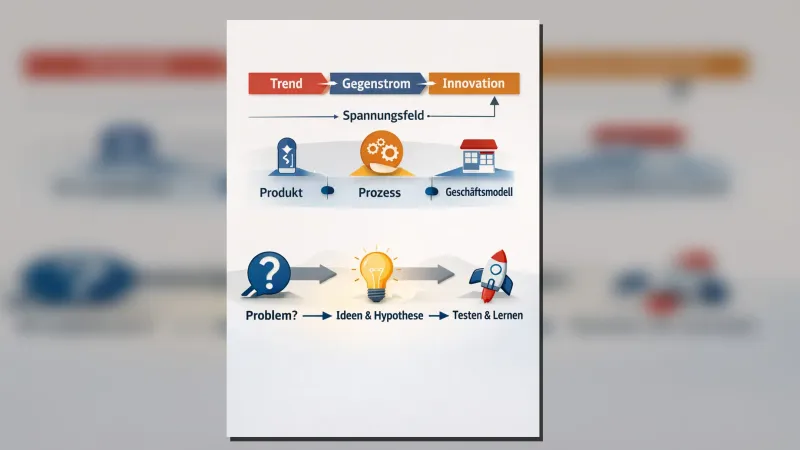 Modul 1 - Innovations-Mindset & Mechanik (2 Stunden): Gemeinsame Sprache, pragmatisches Innovationsverständnis und ein Trend/Gegenstrom-Impuls, der Spannungsfelder in konkrete Suchfelder überführt. Ergebnis: ein kompakter Innovations-Canvas als gemeinsame Arbeitsbasis.