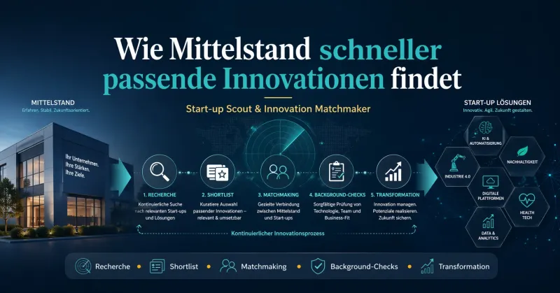 Für mittelständische Unternehmen ist das besonders relevant. Denn viele Betriebe verfügen weder über eigene Innovation-Scouts noch über Ressourcen, um den Startup-Markt kontinuierlich zu beobachten. Gleichzeitig wächst der Druck, schneller auf neue Technologien, veränderte Kundenerwartungen und neue Wettbewerber zu reagieren. Wer heute keine systematische Antwort auf diese Entwicklung findet, riskiert, morgen den Anschluss zu verlieren.