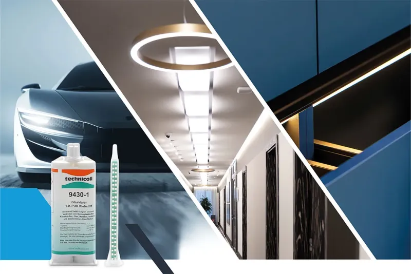 Auch in Fahrzeugen werden zunehmend dekorative und funktionale Licht- und LED-Elemente verbaut. Farbige Lichtleisten an Türen oder Armaturenbrettern, leuchtende Zierleisten oder Markenlogos, beleuchtete Einstiegsleisten oder LED-Scheinwerfer sind nicht nur ästhetisch relevant, sondern häufig auch ein wichtiges Marketinginstrument, mit dem Firmen die Attraktivität, Sichtbarkeit und Lebensdauer ihrer Produkte gezielt erhöhen. Ein Klebstoff, der wie technicoll® 9430-1 nach der Verarbeitung dauerhaft transparent bleibt, Risse und Materialverfärbungen verhindert, erspart den Firmen viel Ärger. Ein weiterer Vorteil des Klebstoffs ist, dass er in Innenräumen und Fahrzeugumgebungen mit wechselnden Temperaturen zuverlässig funktioniert. Damit bietet er eine dauerhafte Lösung für anspruchsvolle LED-Anwendungen im Design- und Funktionsbereich. Auf den häufig im Fahrzeugbau verwendeten Kunststoffen PMMA und PC sorgt technicoll® 9430-1 für eine blasenfreie Optik. Die Klebestellen bleiben nahezu unsichtbar und das Erscheinungsbild transparenter Bauteile wird nicht beeinträchtigt. Der Klebstoff ist zudem lösemittelfrei. Da er durch die chemische Reaktion seiner beiden Komponenten aushärtet, gewährleistet er ein prozesssicheres Kleben unter hochanspruchsvollen Produktionsbedingungen.